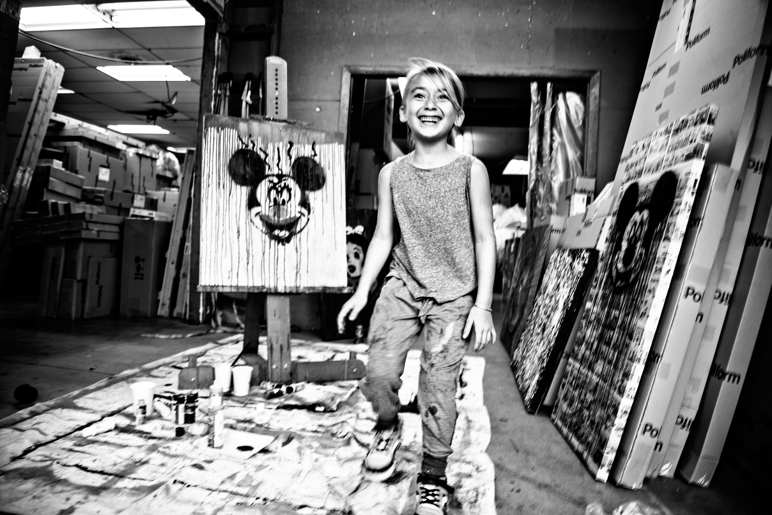 Most of her artwork is improvised — she doesn’t plan what colors she’ll be using or how it’s going to turn out. I watched one afternoon as she painted a base coat of pale blue on a large board, then sprayed black paint over a Mickey Mouse stencil. She gave him red lips, eyebrows and allowed a band of crimson to drip slowly down his face. Then she was done. “Is there more canvas?” she asked her dad. When I asked her about her artwork — why she likes to paint, how does she know when a painting’s finished — she responded like a typical 7-year-old: with a shy smile, a shrug and “I don’t know.” But she speaks up readily about why she sells her paintings: “To help people stay warm.”