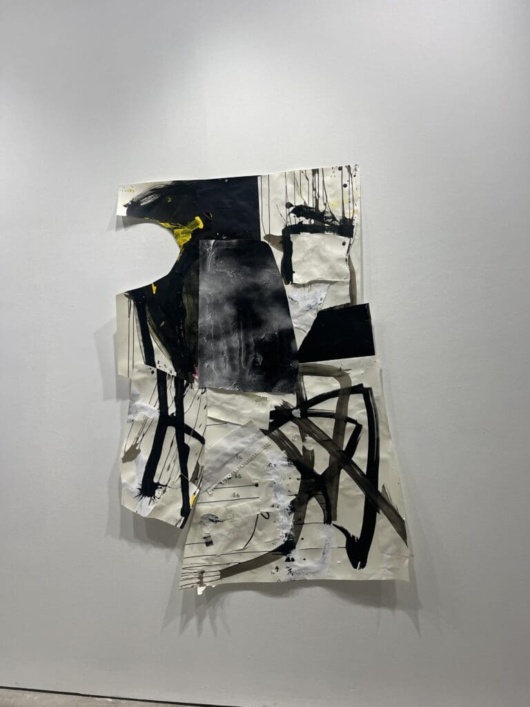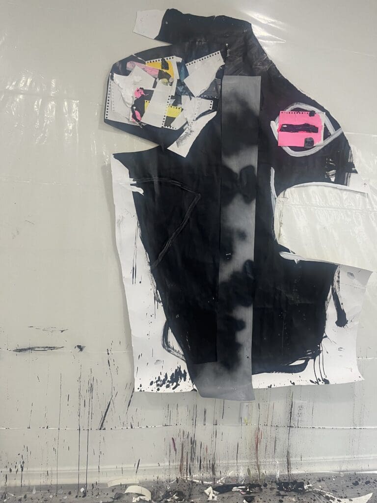 “I’ve always been interested in the collision,” he says. “Spontaneous, gestural mark-making right next to something meticulously taped and cut. Your hand moves differently. It’s like cursive versus a scribble. Same tool, completely different part of the brain.”