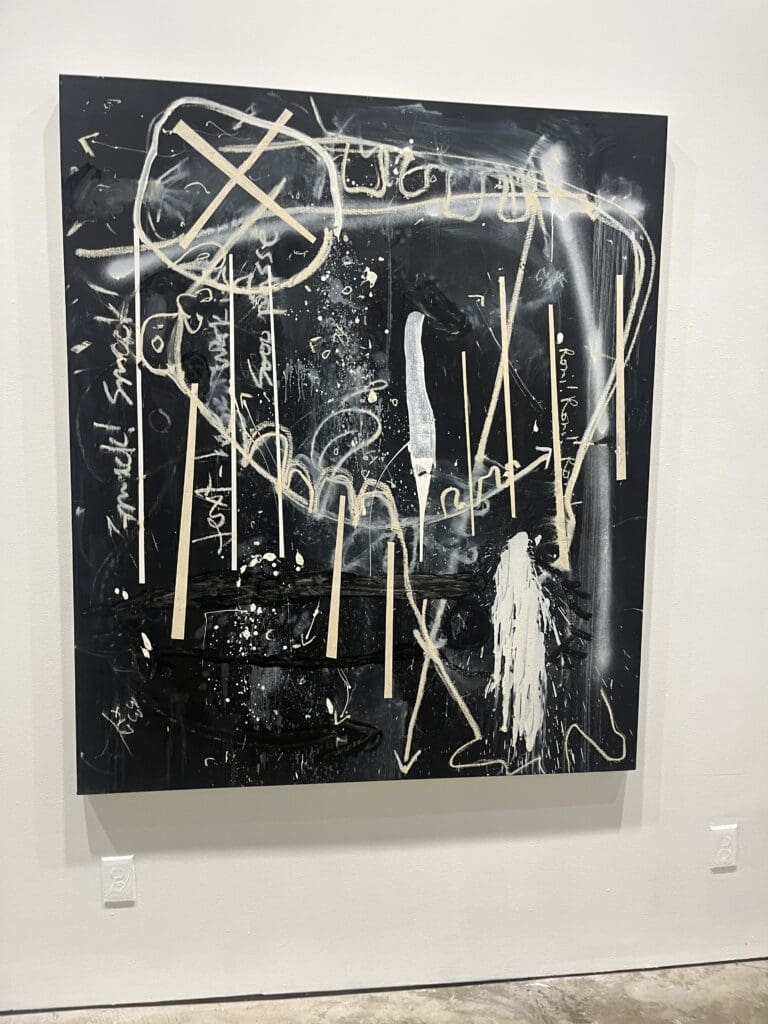 “I think it’s fine he used anarchy, but I don’t love the implication that there’s no thought, no order, no formal rigor,” Sherman tells PaperCity. “A friend calls it controlled chaos. There are passages that are intentionally chaotic, and then they’re roped in by structure. So the composition actually coheres. If it’s just noise, the painting’s forgettable.”