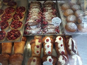 My favorite pastries, ever, are Neapolitan. They are sublime. Lots of ricotta blended with lemon and subtle flavors I cannot identify. Custards are covered with tiny glazed wild strawberries, cannoli speckled with bits of dried citron and orange, babas swim in liqueur.