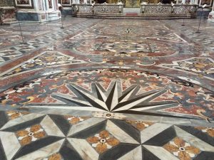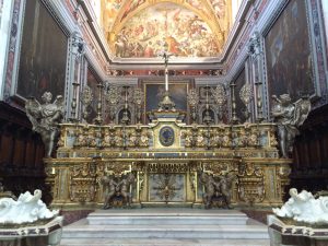 The monastery’s church is, as our guide Pina said, “like walking into a painting.” Entering this place, I could hardly take my eyes off the elaborately patterned marble floor. When, at last, I looked upward, there was more. And more. Carved marble with lapis insets, marble columns, golden angels, saints and martyrs, and then, skyward, the ceiling frescos.