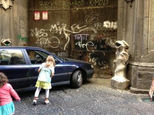 “Restauro” did not deter us from experiencing as much of Naples as possible. Let me recount what draws me to the place: First, there is the pulsing energy of the city and the dance-like way that traffic and people move. The streets teem with humans and cars, Vespas and delivery vans. Pedestrians wend their way through traffic as if through tall grass. Neapolitans can walk within inches of moving cars, and drivers allow them this meander to the opposite side of a street. There are few signal lights and no discernible lanes; instead, one experiences rhythms in play. I sense that both drivers and pedestrians feel those rhythms and act on them, moment to moment.