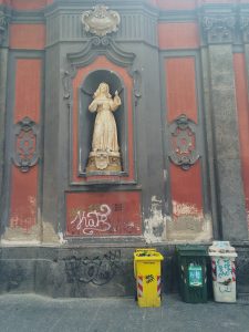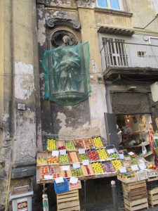 Naples is frenetic, idiosyncratic. Naples is a mess. A mess of scaffolding and “restauro” (under restoration). The city is crumbling, and one wonders if the restoration of so many buildings will ever be completed. Three years ago, I photographed a fruit stand open for business below an angel covered in green netting. On this trip, we noticed that the fruit stand no longer expands into the space below the angel. The angel and its church are covered with plywood and signage describing a restoration process.