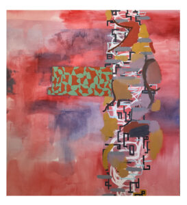 With his current show, Mountain View, Schwarz abandons the mixed media approach in favor of large-scale, mostly abstract paintings. Each of the nine paintings has a distinctive look. The multi-hued background of “Untitled (2502)” consists of white, red, and shades of blue. Its grayish foreground could suggest rain on a window or a kind of melty dystopian scene with atmospheric change. In “Untitled (2504),” a blue and white asymmetrical form is set against a black backdrop, with white oil paint that seems to drip from the form.
