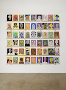 Also in the exhibition is a set of 54 miniature gouache on linen on panel paintings entitled “Cyclopes (18-54-21-1).” Each of the Cyclopean figures is unique and funny, existing in a zone between campy and quirky. Instead of quoting from Euripides, it’s easy to imagine these mysterious figures as comic book characters closer to the idea of the radioactive Cyclops in Bert I. Gordon’s B-movie The Cyclops (1957).