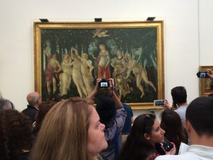 We vowed we’d not revisit the Uffizi on this trip, because of jam-packed crowds. But on our last day in Florence, inexplicably, there was no line outside the Uffizi. We bought tickets, put our bags through a metal detector, and discovered that the NO PHOTOS restriction had been lifted.
