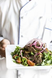 The two-story restaurant crackles with excitement as heads swivel to see who’s coming and going, drinking and dining. Upstairs, girls in short Suzie Wong Cheongsam dresses greet those who want to lounge and enjoy a lychee martini or Saigon gin (a tincture of St. Germain liqueur, lime juice, cucumber, and gin) or light bites outside on the open-air veranda or inside overlooking the sparkling, fairy-lit trees after dark.