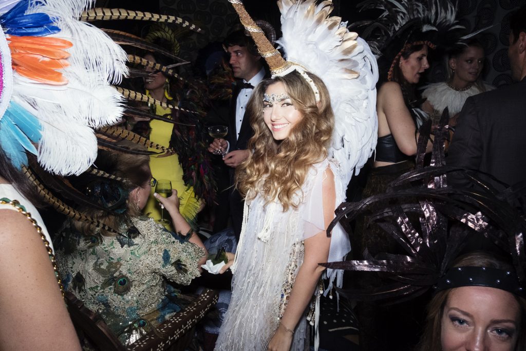It was my lucky night, as I was seated at the lavish dinner between two of my favorite Texas girls. On one side, I had Georgina Hartland from Dallas, who was resplendent in Valentino. (For the Eccentric Jungle the night prior, she wore a Michael Faircloth couture dress with peacock feathers, while daughter-in-law Nasiba Hartland-Mackie, who also lives in Dallas, played a radiant unicorn in Rodarte.) To my other side was Dallas-born, New York–based Amy Phelan, who donned a shocking-pink gown by Oscar de la Renta and a headpiece of hundreds of pink butterflies designed by Los Angeles milliner Fabhatters.