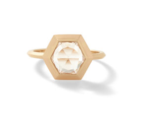 “This is the first diamond we bought when I started my company, a portrait-cut so it’s thin, like a sheet of glass,” she says. “I haven’t been taking it off.”