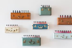 Barton continues her green theme throughout the space with re-purposed suitcases and furniture used as shelving; the pedicure area’s backdrop wall is made of tin recovered from a downtown Dallas building.