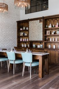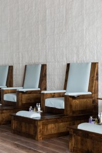There’s also a luxury lounge, private dressing areas, manicure bar, intimate retail area, and custom pedicure chairs. (Barton’s former woodworking teacher at Ennis High School referred her to a woodshop in Ennis to build the chairs. Each has a tub basin hidden under sliding doors made of wood and brass.)