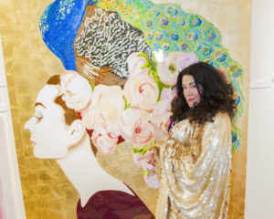 The artist, in a dramatic gold sequined robe, charmed guests with a personality to match her artwork – smart, bold, larger than life, and insanely fun – with a generous dash of glitter.
