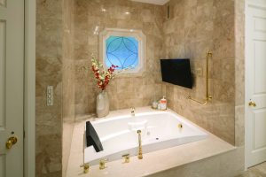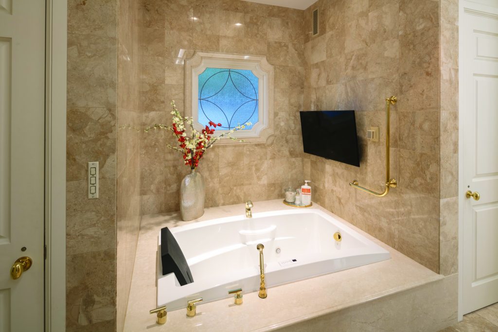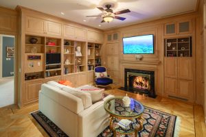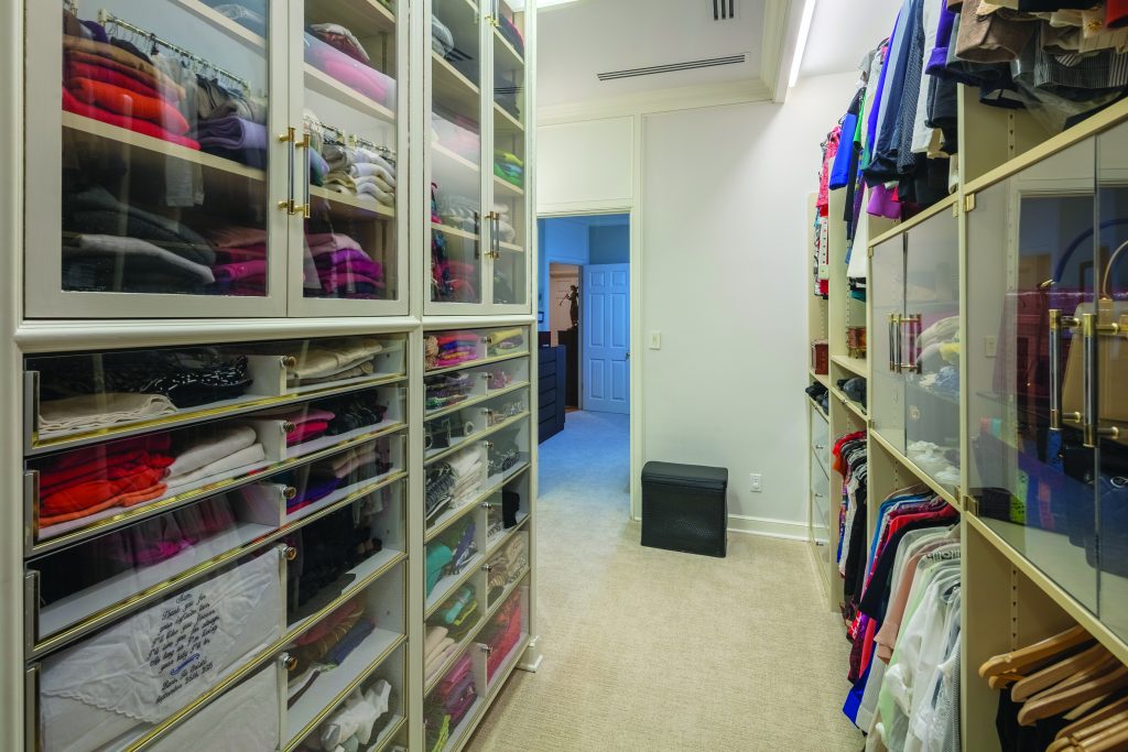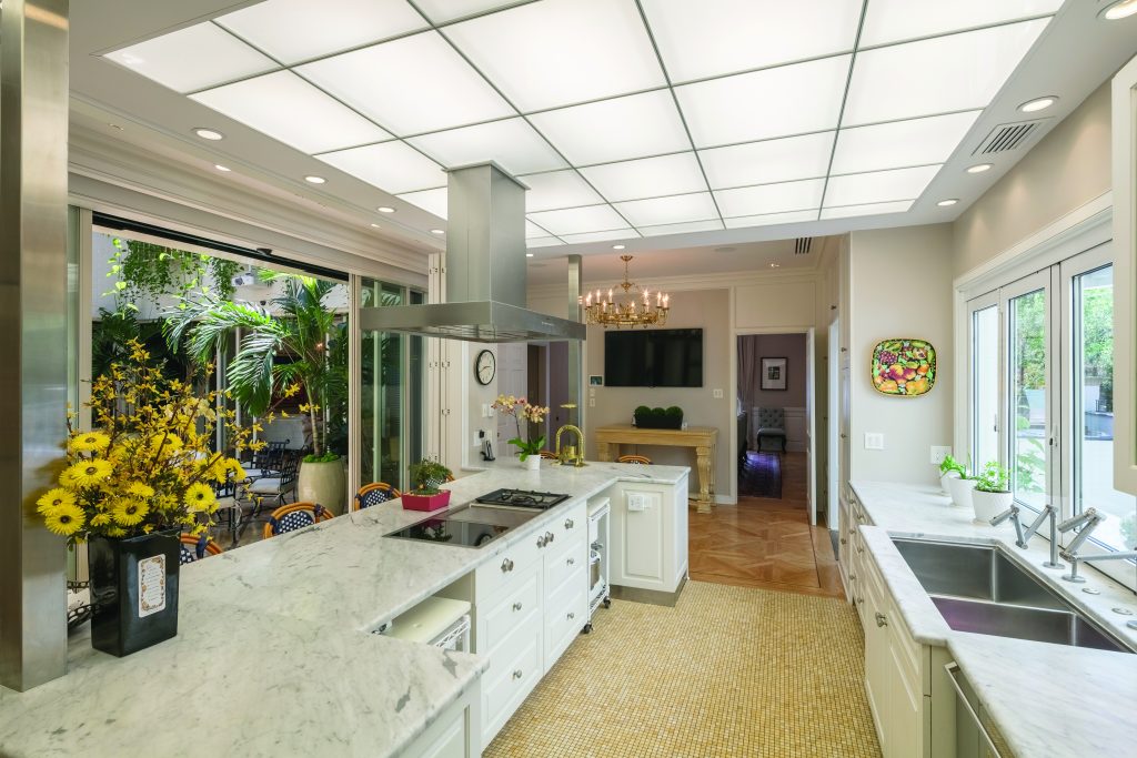 Michael explains that this kitchen, one of three, is where he and Lucia prepare their meals. But when the entire family is on hand, the outdoor kitchen comes into play. And what a cooking area. It includes a wood-burning pizza oven, a rotisserie grill, double burners and a refrigerator — all overlooking the pool terrace which resembles that of an elegant villa in Cabo. The third kitchen? It’s a catering kitchen in the garage.