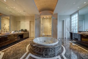 There are six large bedrooms, seven bathrooms, and two powder baths. The extravagant master suite features a private sitting area, a fireplace, and a huge bathroom with a round bathtub in the center.