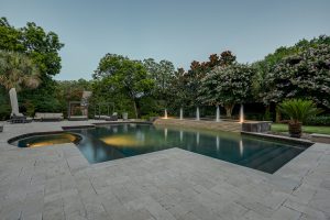 Of course, no mansion is complete without a killer backyard. This one has a glass mosaic resort-style pool with a fountain and a hot tub, and a covered patio with an outdoor fireplace and grill.
