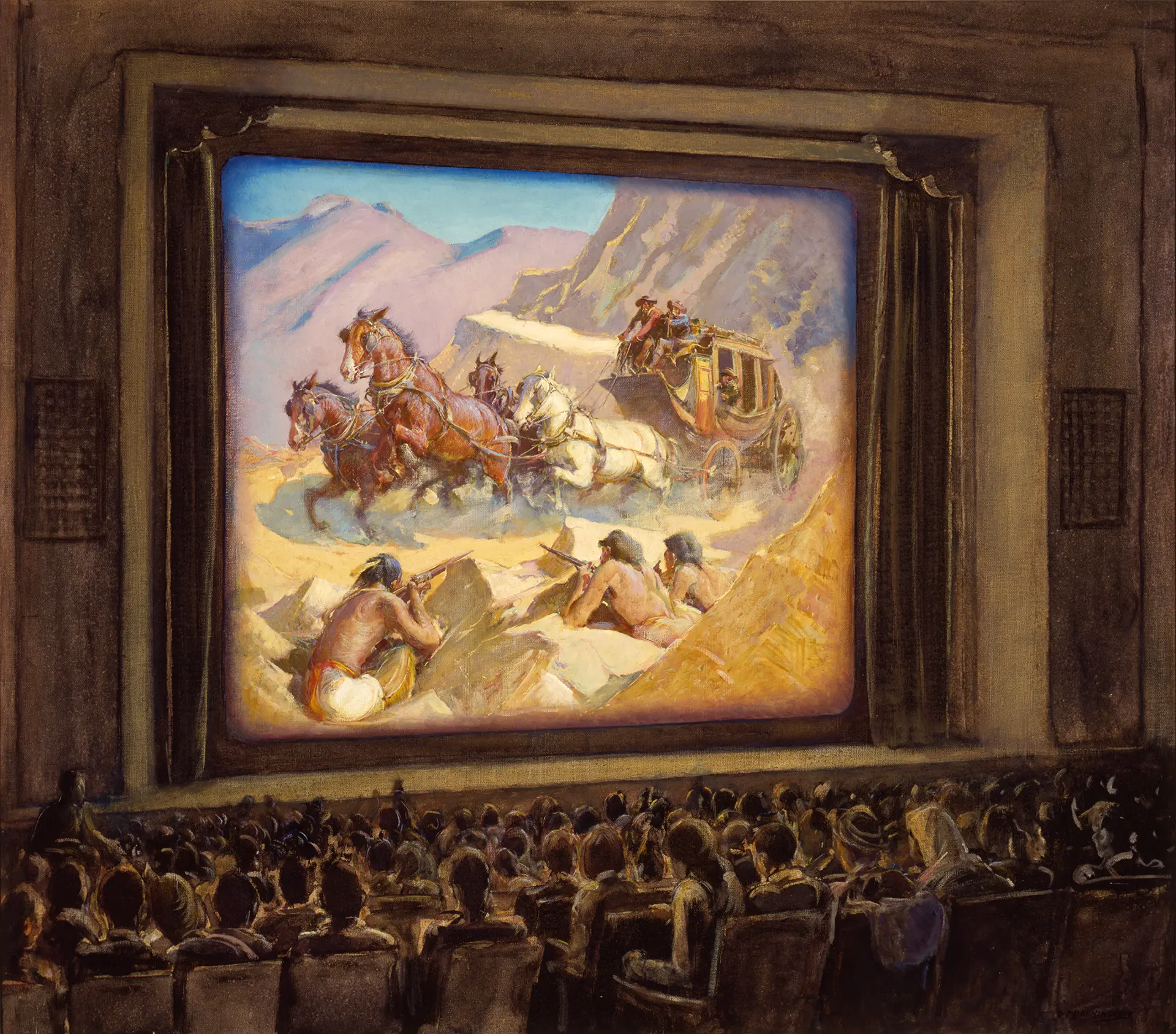 Taos, New Mexico-based artist Oscar Berninghaus, who was known for his paintings of Native Americans and the American Southwest, also has a small part of the exhibition. His painting “Movie Night, Taos Theater” (1939) is paired with the movie poster for John Ford’s Stagecoach (1939) and the Sid Richardson Museum’s painting, “A Taint on the Wind” (1909).