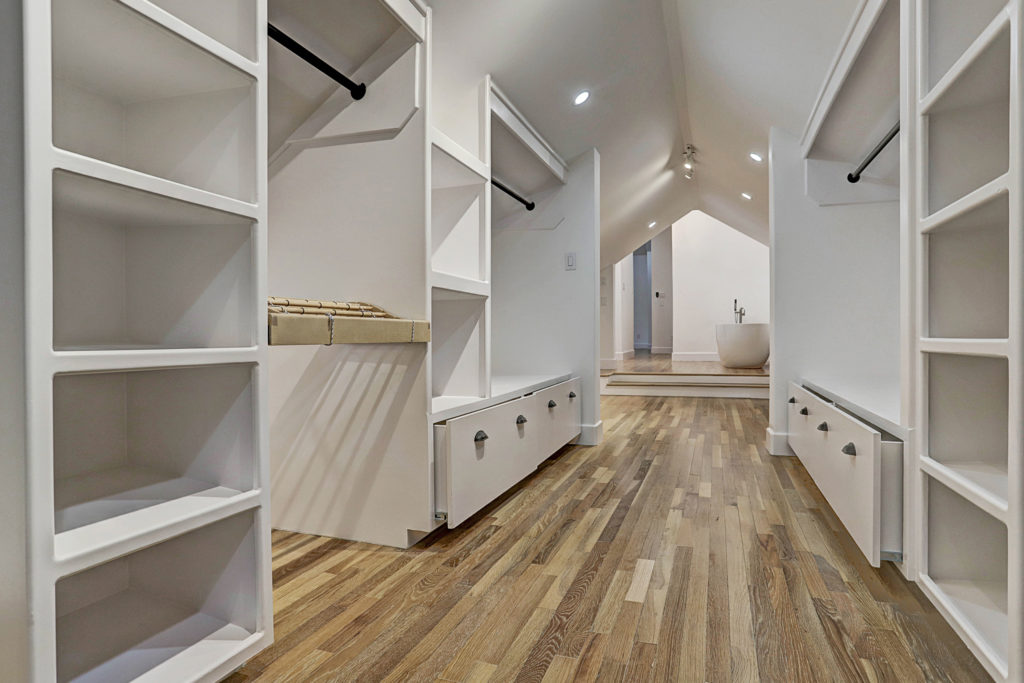 Contemporary nods include white oak floors, Samsung smart kitchen appliances, quartzite counters, a hand-painted tiled powder bath and a master suite with a mega closet, unheard of in homes of that era, thus a genius reconfiguring on the upper floor.
