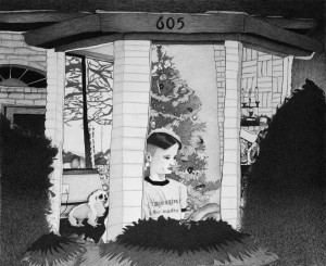 Always, in year’s past, there was a sense that the viewer via Bise was floating over a scene, observing it from above as an omnipresent onlooker. Now, the master of drawing returns to a previous theme — his evangelical-leaning family, directed by his father, a staunch adherer to a literal interpretation of the Bible. But what is new now is Bise’s perspective in “Born Again,” which also marks Bise’s seventh solo with Moody Gallery. The audience enters the world of familial scenes evoked by each drawing through a literal and metaphorical perspective that is more accessible perhaps than his previous drawing, and also more immediate, hence more impactful.