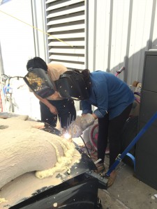 “It has taken 10 students 30 hours a week for 15 weeks to finish this beauty,” she added. “We sculpted the figures (and dragon) out of one-pound bead foam, covered it with synthetic stucco and then decorated it with jewels, gee-gaws, and whatever we could find a bunch of for free. Charming Charlie has donated boxes and boxes of jewelry for us to bedazzle our creation, and Mancuso Harley-Davidson on the North Loop has donated all the lovely chrome that my students have welded onto the car to make it so beautiful!. Underneath it all is a 1993 Nissan Sentra. We’ve certainly improved it.”