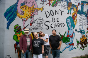 BY Saranna Zhang //Redbud Arts Center president Gus Kopriva, executive director Tanya Peterson, Marjory Johnston, Carlos Alcaraz (Empyre) get together at the "Don't Be Scared" mural honoring the late artist Daniel Johnston. (Photo by Saranna Zhang/Kevin Zhang Photography)