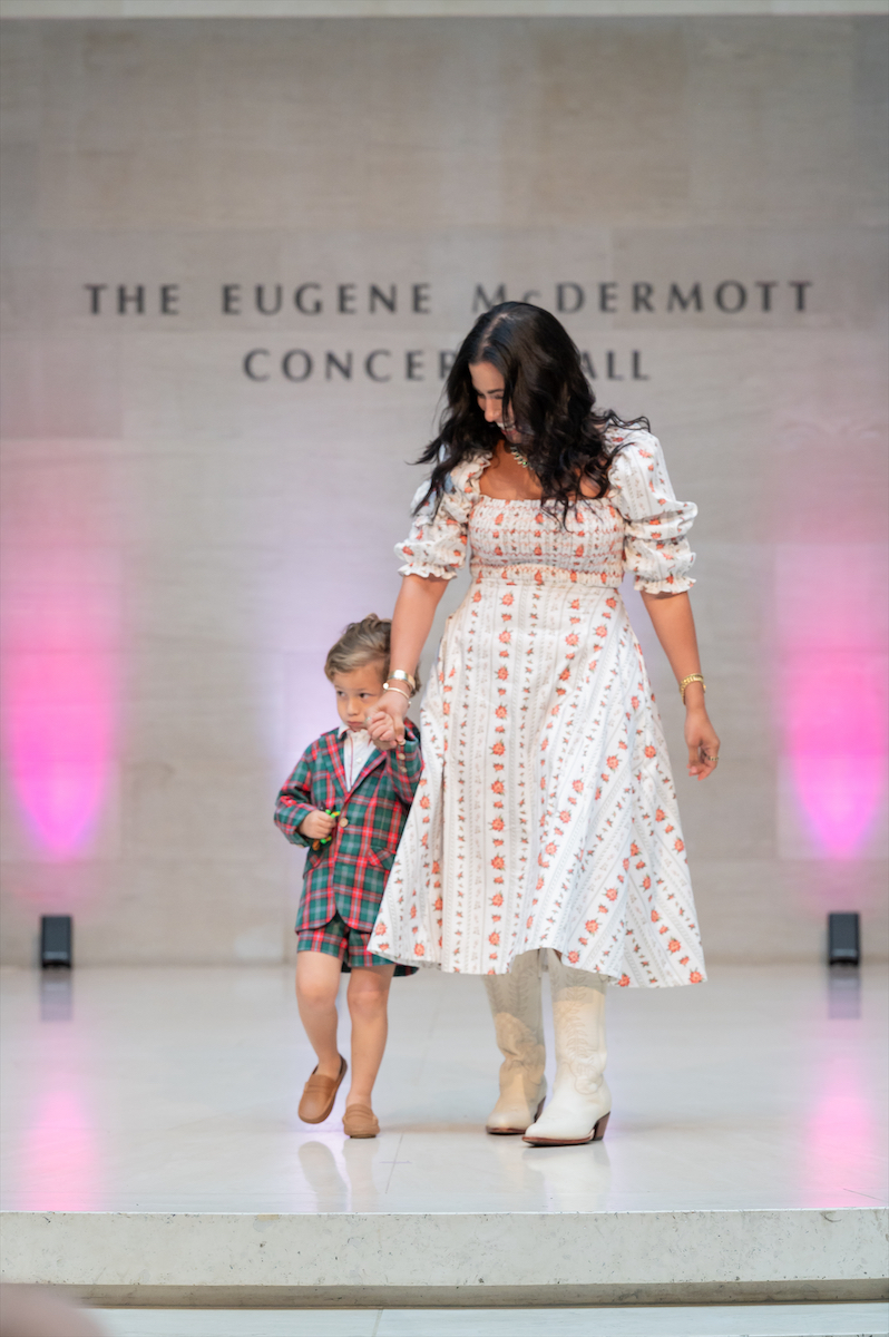 Mothers and their children floated down the runway, modeling frothy frocks by LoveShackFancy and Dondolo, whose founder, Catalina Gonzalez Jorba, received the 2023 Fashion Notes Designer Award in honor of her creative vision for the luxury children’s and women’s lifestyle brand. Jorba walked the runway alongside charmingly bashful Robert, her youngest of four sons, who wore a festive tartan suit and tiny driving loafers.
