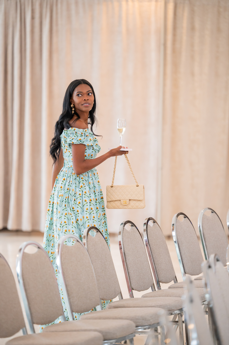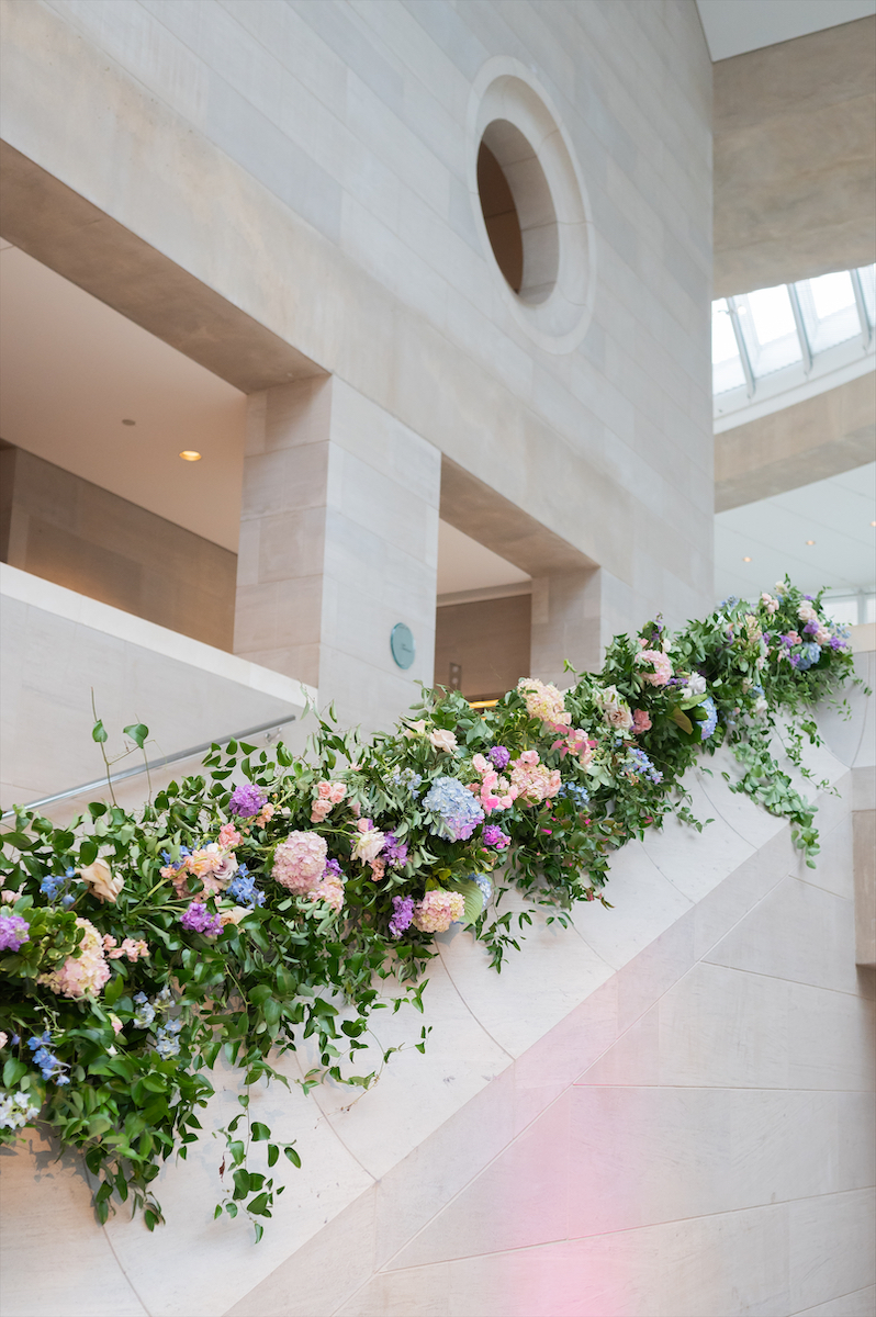 A magnificent floral installation by Petal & Field Floral Co. romantically cascaded down the Meyerson’s staircase, elegantly framing the runway for the event’s fashion show. Paired with the audial delight of handsome young violinist Alan Milan playing recognizable pop music, the whole affair felt downright Bridgerton (minus the gossip and naughty bits). Listening to Taylor Swift’s “Wildest Dreams” on the violin while you’re sipping champagne just hits differently!