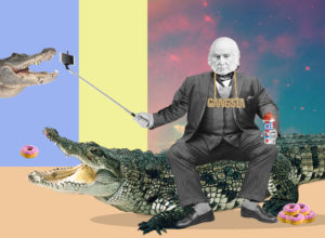 In her latest works, Honest Abe careens by on a Vespa; John F. Kennedy gives a peace sign; George H.W. Bush poses in Renaissance garb with his steadfast canine and a stalk of broccoli; Bill Clinton reclines à la Burt Reynolds and basks in a sea of fast food; and Martin Van Buren “spins some sweet beats,” McLaurin says.