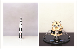 This photograph was the lead image for the exhibition. In this series, Peet asked participants to choose objects that are special to them. She photographed the objects in the space they reside, and then combined similar objects. This photograph celebrates objects that earned Houston the title of “Space City.”