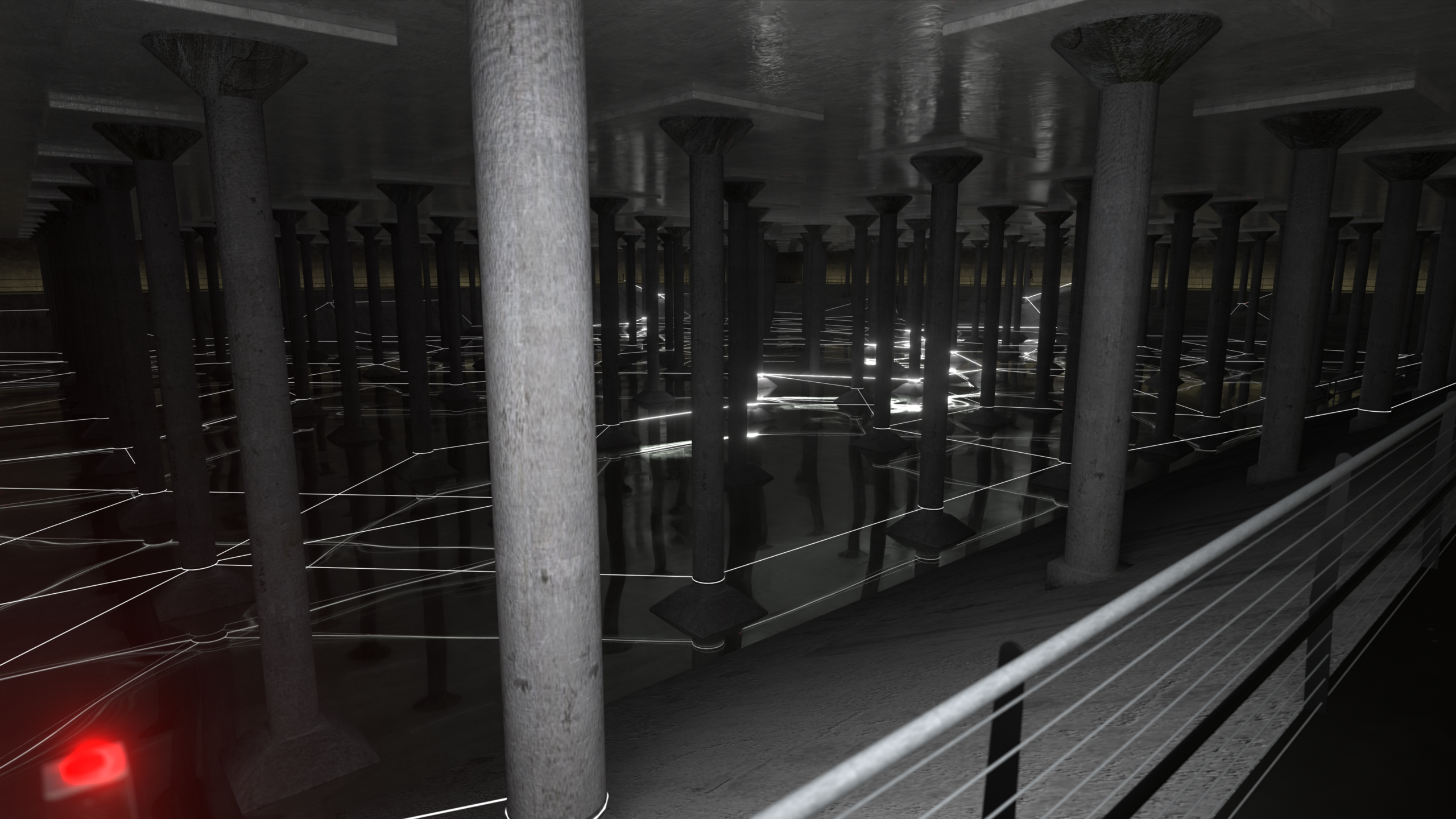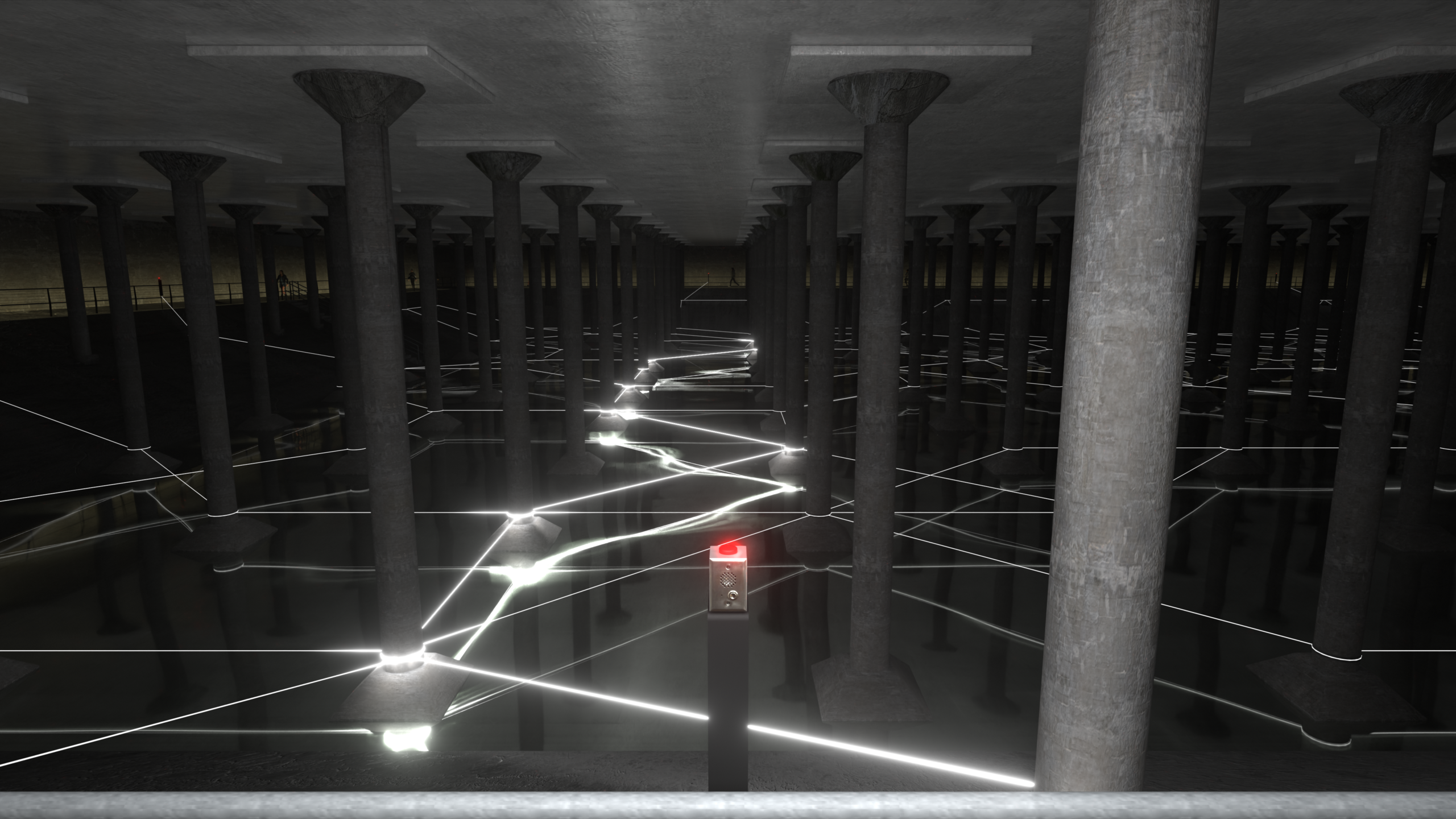 The installation is structured around a network of eight intercoms dispersed throughout the Buffalo Bayou Park Cistern. Visitors press a button and speak. Their voice becomes light. Pulses travel through the cavernous darkness, ricocheting across the columns until they resolve at another point in the space.