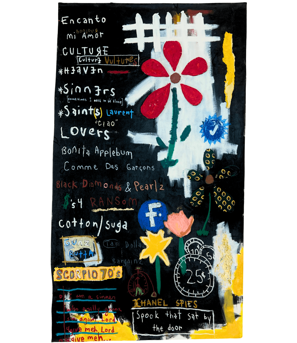 “My day usually starts by waking up around 11 am or 1 pm,” French says. “Once you’re into making a painting, it commands attention. It’s almost like being a clingy partner or boyfriend, or girlfriend. You have to be in front of the painting. You have to listen to it.