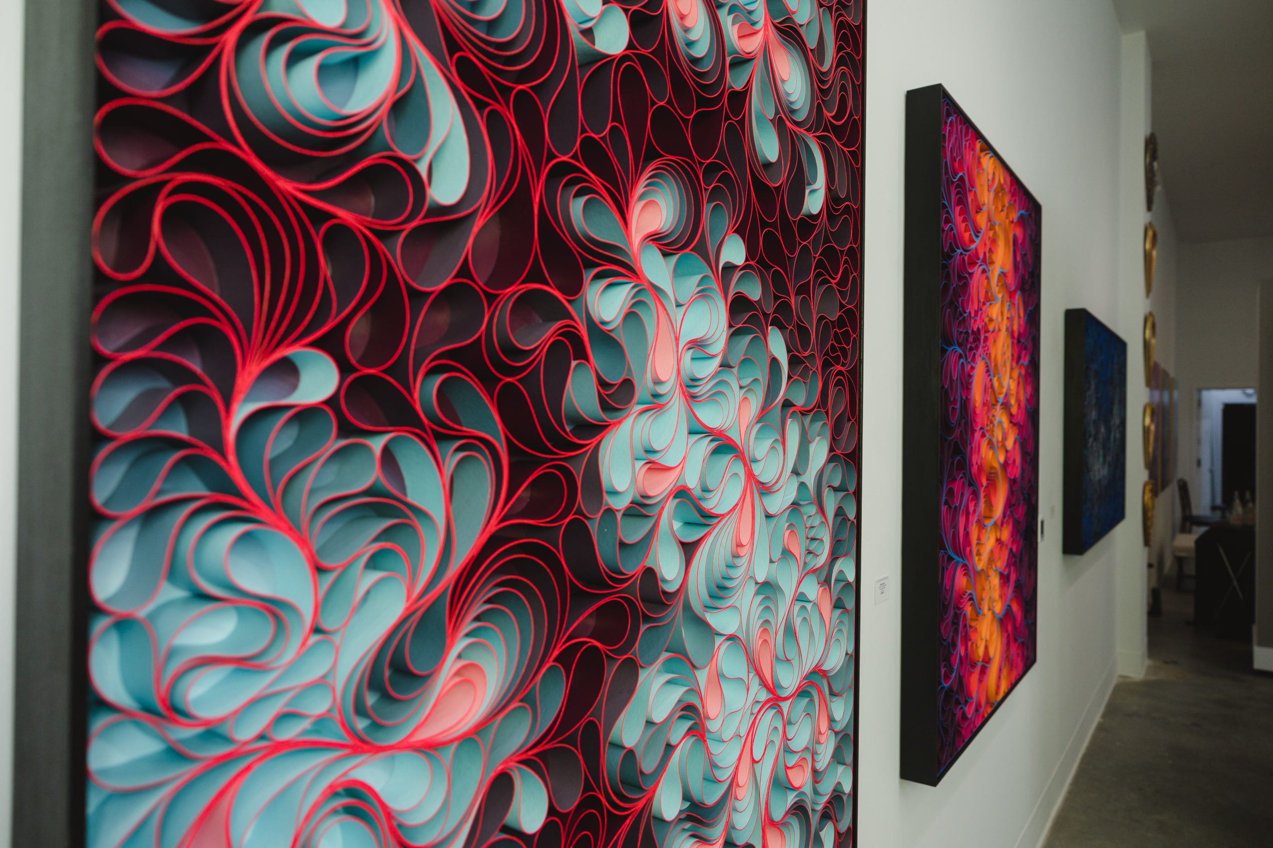 In her newest body of work, “The Space Between Stars,” Pardue transports the viewer beyond the sensuality and physicality of the painting’s surface. Through varied palettes and organic forms, the relationship between positive and negative space brings to the surface the interconnectivity of all things and the continuum of unimaginable space.
