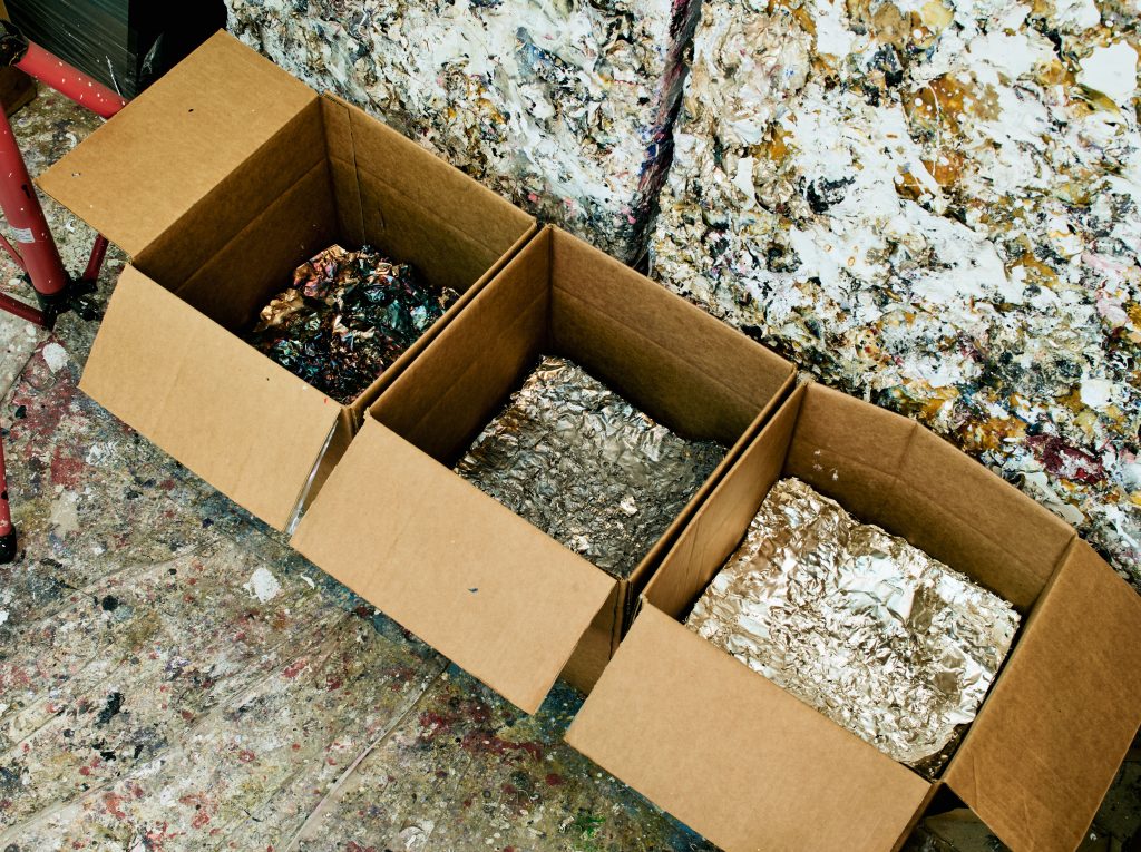But the true magic happens aboveground, in the studio itself. Being left uninterrupted to gaze, poke through the boxes, and take in canvases in process was akin to dissecting a specimen at a science project. Skeins of plastic-feeling paint, sheets of gold, and silver leaf — prepared by a specialist and awaiting alchemical transformation on the canvas — were littered throughout and piled in cardboard boxes. Eggshells, stand-ins for the sun the artist later reveals, were also part of the equation. Three-dimensional, mountainous, dramatic surfaces of canvases resemble a topographic journey; a series of these works in progress rests horizontally on eight-foot folding tables. The expansive windows, which can slide back to provide direct access to the pool, bear waterfalls of acrylic paint.
