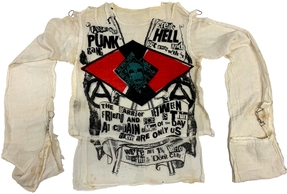 And, for those who cling to pieces you scored in the 1980s at some New Wave emporium or from Vivienne Westwood’s recent collections, there’s much here to feed your fashionable soul. Clothing was an integral part — a non-uniform uniform — of the nonconformist movement, posing the question: What came first, punk fashion or punk music? Myriad international designers reference that era when mining inspiration for their collections today. Look no further than Raf Simons and Hedi Slimane. The garments of that era were literally torn apart and reimagined with safety pins and patches. On view are items from revolutionary boutiques such as BOY and Westwood’s SEX and Seditionaries on King’s Road in 1970s London.
