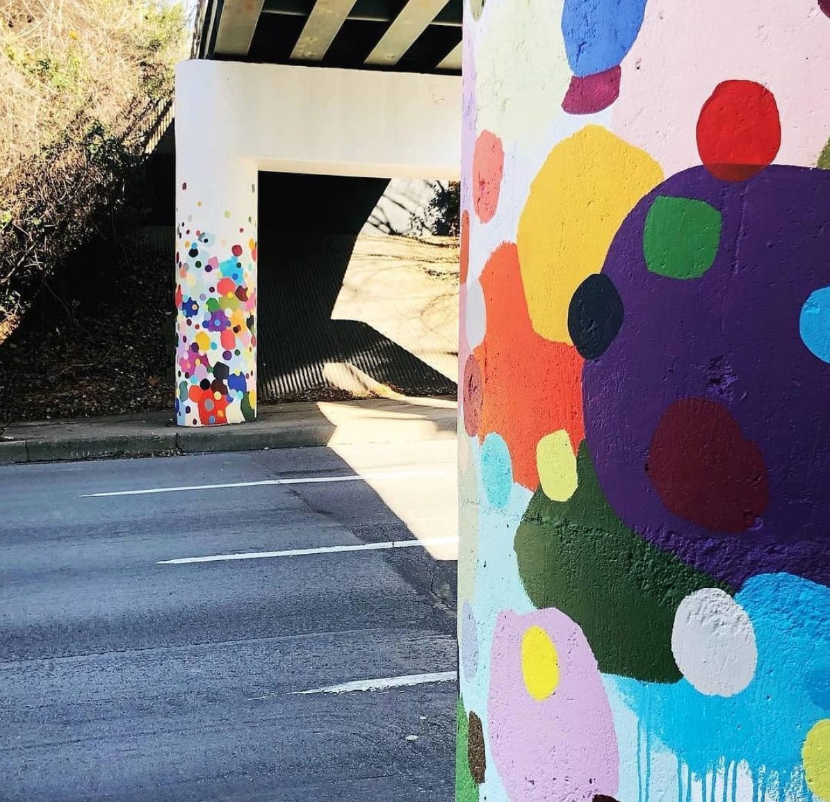 On Lemmon Avenue, Laura Mayberry painted the color dot murals you see on the pillars under the bridge. She also just finished up a very Instagrammable mural outside of The Grey Stitch in Fort Worth.