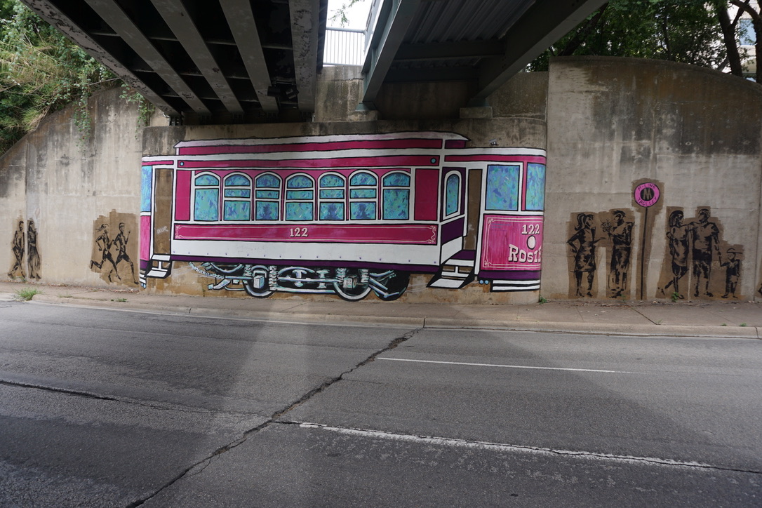 The giant McKinney Avenue Trolley called “Rosie” that you pass on Cedar Springs Road was also done by Pohlman in collaboration with Corinne Bizzle. The two joined forces on the big “Uptown” mural on the other side of the street as well.
