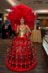 Rubies were the appropriate theme for the special anniversary, the mood set by the champagne girl, dressed all in red including her feather headdress, who welcomed guests as they arrived.