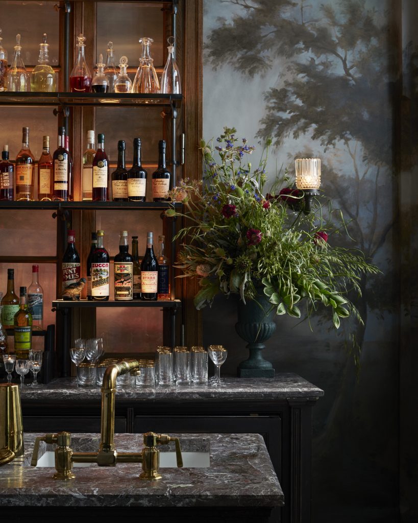 The bar — or, shall we say, salon — is the show stopper. Set into a private space, it’s framed by a 13-foot vaulted ceiling and hand-troweled plaster walls, with a retro- fitted early-20th-century oak French door with beveled glass and bronze hardware. A moody hand-painted mural based on the work of 18th-century French landscape painter Hubert Robert covers the walls.