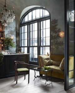 But we’re going for the design. Behind the poetic rooms are Architectural Digest AD100 designers Roman and Williams, the husband-and-wife team Stephen Alesch and Robin Standefer. Swirling from the high, exposed-concrete ceilings in the dining room are custom pewtered-steel chandeliers with hand-blown glass shades that mimic candlelight. Existing brick has been whitewashed to reveal layers of historic paint, which look authentic but are made with Alesch and Standefer’s special techniques to mimic a lone raw wall on Lafayette Street.