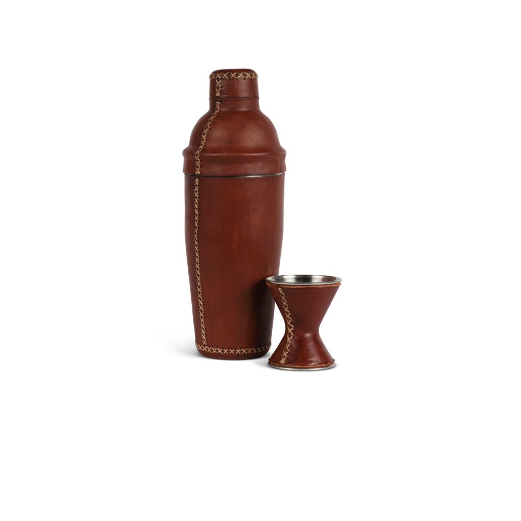 This leather-clad cocktail shaker from King Ranch has a hand-stitched, leather exterior and a stainless steel interior. A double jigger is included. The removable cap has an integrated strainer. At $245, this shaker adds an authentic Texas touch to anyone’s bar.