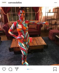 I attended the grand opening party for Canvas and got a peak at all of the art, as well as a preview of the skincare/body art line in human form, walking around the party covered head-to-toe in colorful body paint. But more on that later.