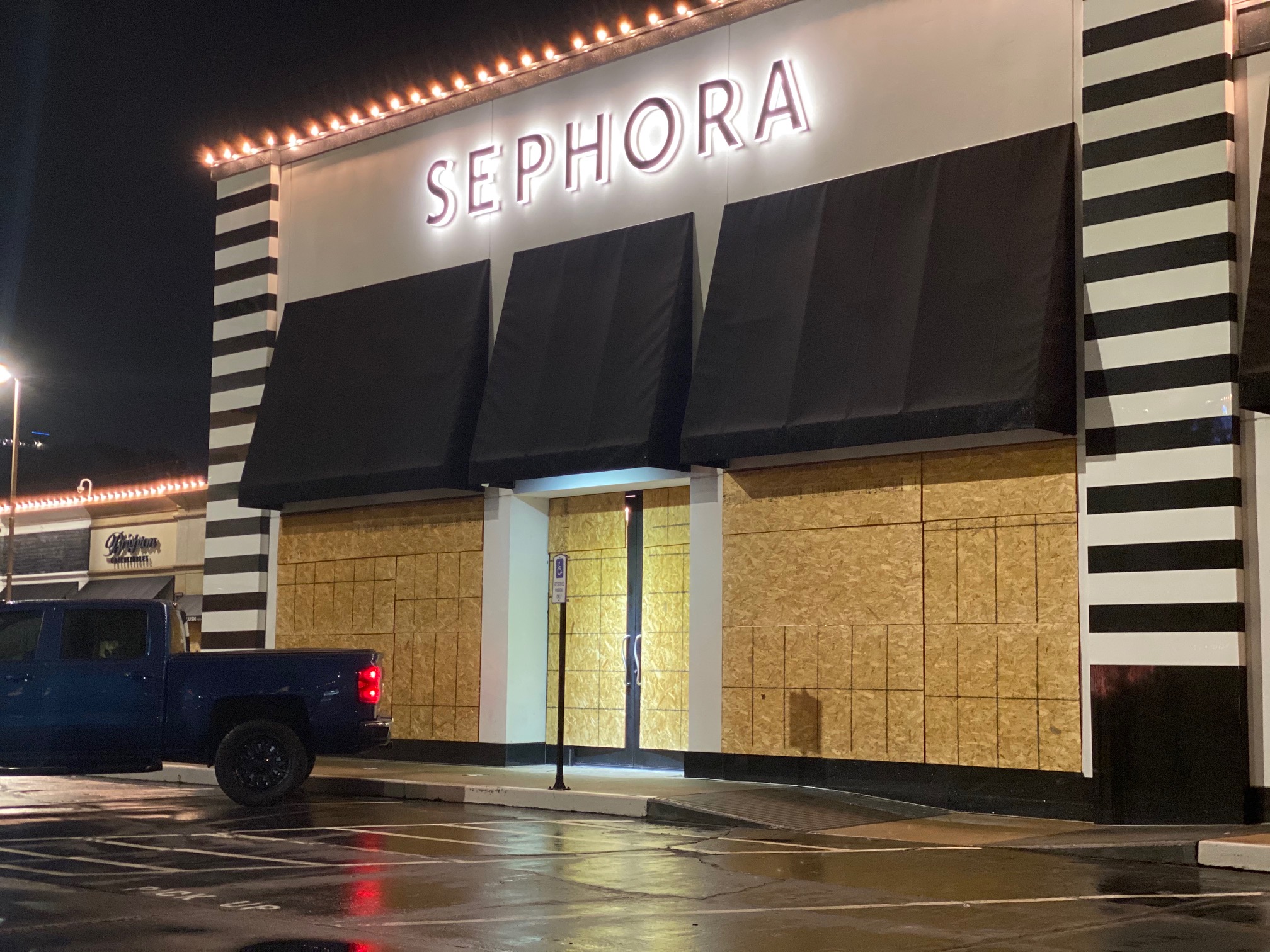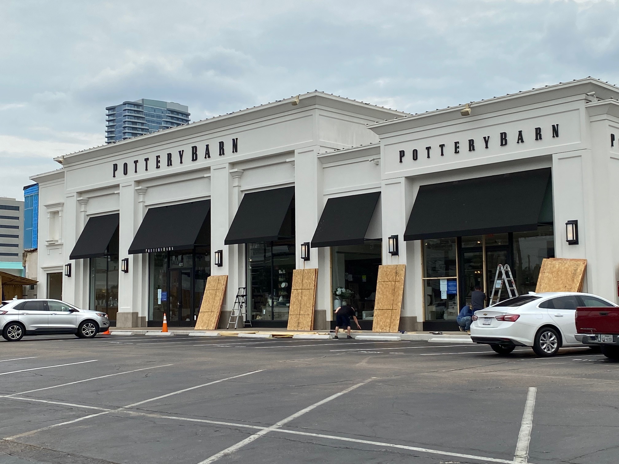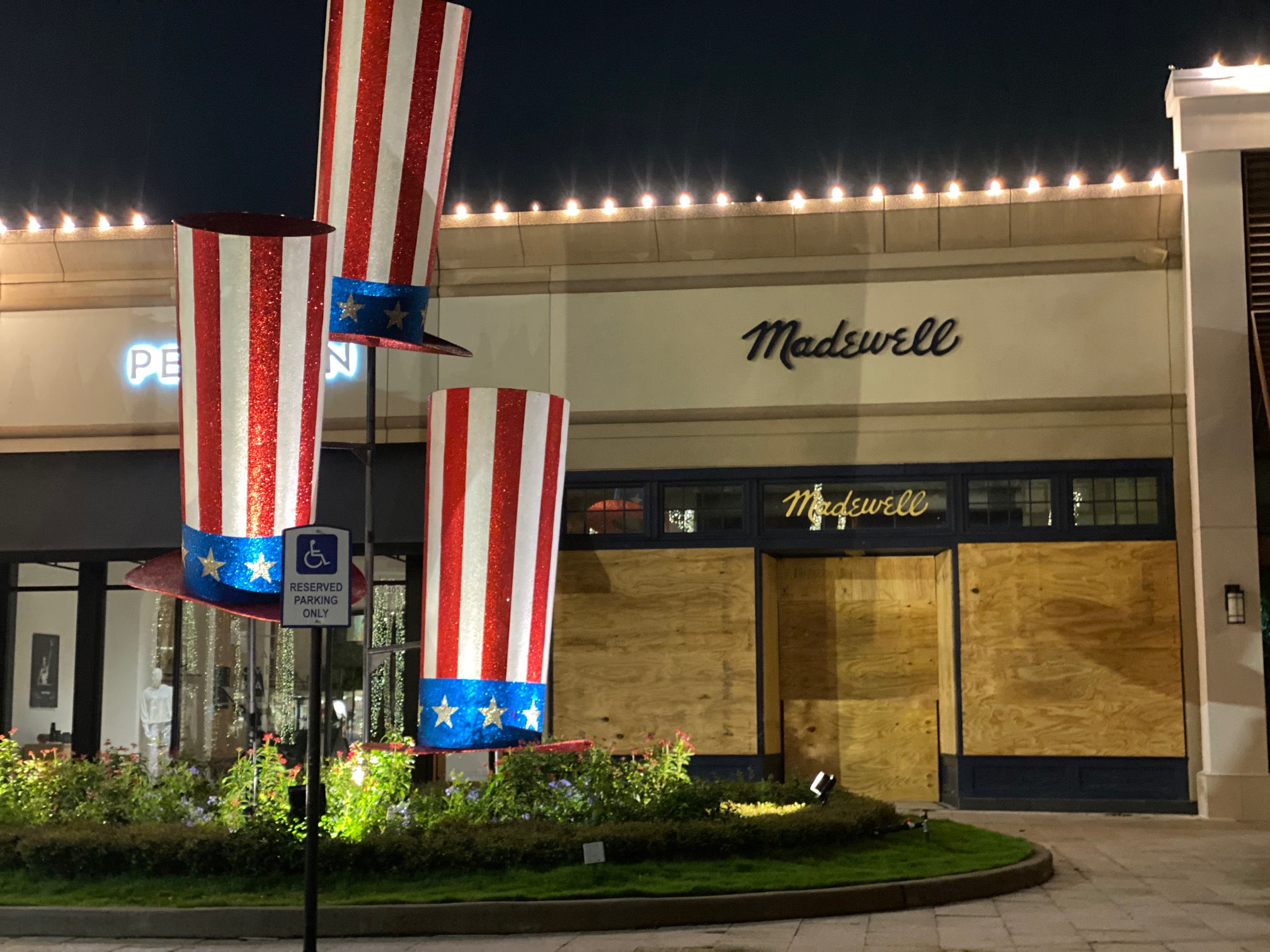 Sunday night, as we drove through Highland Village, we found that Apple, Sephora, Lulumon, J Crew, Crate & Barrel and Madewell were secured behind acres of plywood.