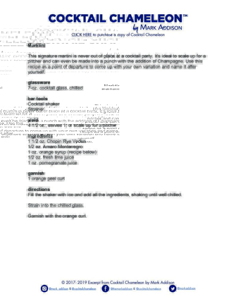 Marktini: This signature martini is never out of place at a cocktail party. It’s ideal to scale up for a pitcher and can even be made into a punch with the addition of champagne. Use this recipe as a point of departure to come up with your own variation and name it after yourself. Recipe, click here.