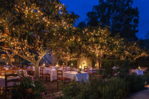 The smells of the California hotel’s fragrant citrus trees, planted herbs, and blooming rose bushes hit you first. Charming ivy-lined cottages and stone buildings dot the garden scenery with the Santa Inez mountain range as the backdrop. All setting an unforgettable scene.