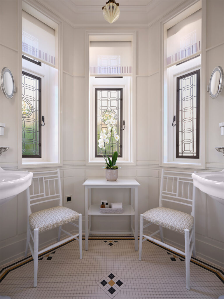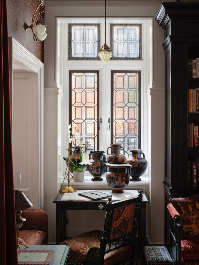 At Sloane’s restaurant is a series of small, romantic salons tucked away on the sixth floor, where natural light streams through stained-glass windows, illuminating a collection of celadon Chinese porcelain evocative of James McNeill Whistler’s iconic Peacock Room. Here, as in all the hotel’s public spaces and guest rooms, harmonizing textiles are masterfully deployed to give the impression of handsome, unmatched furnishings accumulated over time.