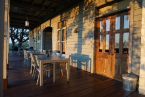 At around 2 pm, we arrived at our destination. The entrance to Sage Hill Inn & Spa is quintessentially Texas. We drove up a dirt path through unmanicured prairie until we came upon a cluster of adorable houses. We checked in and one of the managers gave us a tour of the property. One of the farmhouse-style buildings holds the dining room, library, and a charming back porch.