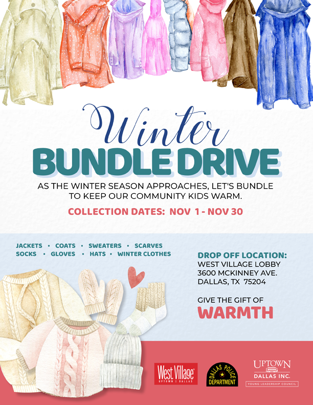 Uptown Dallas Inc. also has a young professionals group known as the Uptown Young Leadership Council. The Young Leadership Council recently started a bundle drive where donations will be going to Family Gateway, a local family shelter. New and gently used cold-weather clothing can be dropped off now through Monday, November 30th at 3600 McKinney Avenue.