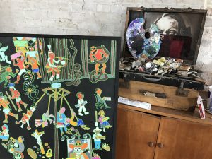 We were swept away by the energy of Clark’s paintings. Intricate design and colors leap from his canvases. He paints Aztecs, gang members, and cultural icons, all in tightly interwoven patterns, all pulsing with life. Mesmerizing. Clark exhibits his paintings in groups – much like quilt patchwork. Each painting interlocks with the next, and the next. We longed to bring one of his paintings back home to Houston in the truck of our car.
