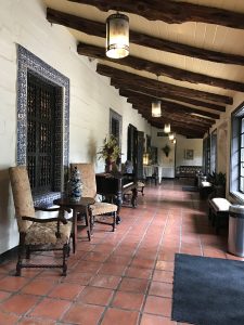There is one room at Quinta Mazatlan unlike the others — an explosion of hot pink, purple and orange with a myriad of detail. Earl and I were enchanted with this space that overflows with Ann Maddox Moore’s collection of Mexican folk art. The walls and ceiling are a mass of vignettes with Virgins of Guadalupe, carved and painted animals, Last Suppers, cathedrals, skeletons, devils, beaded snakes, and mermaids.