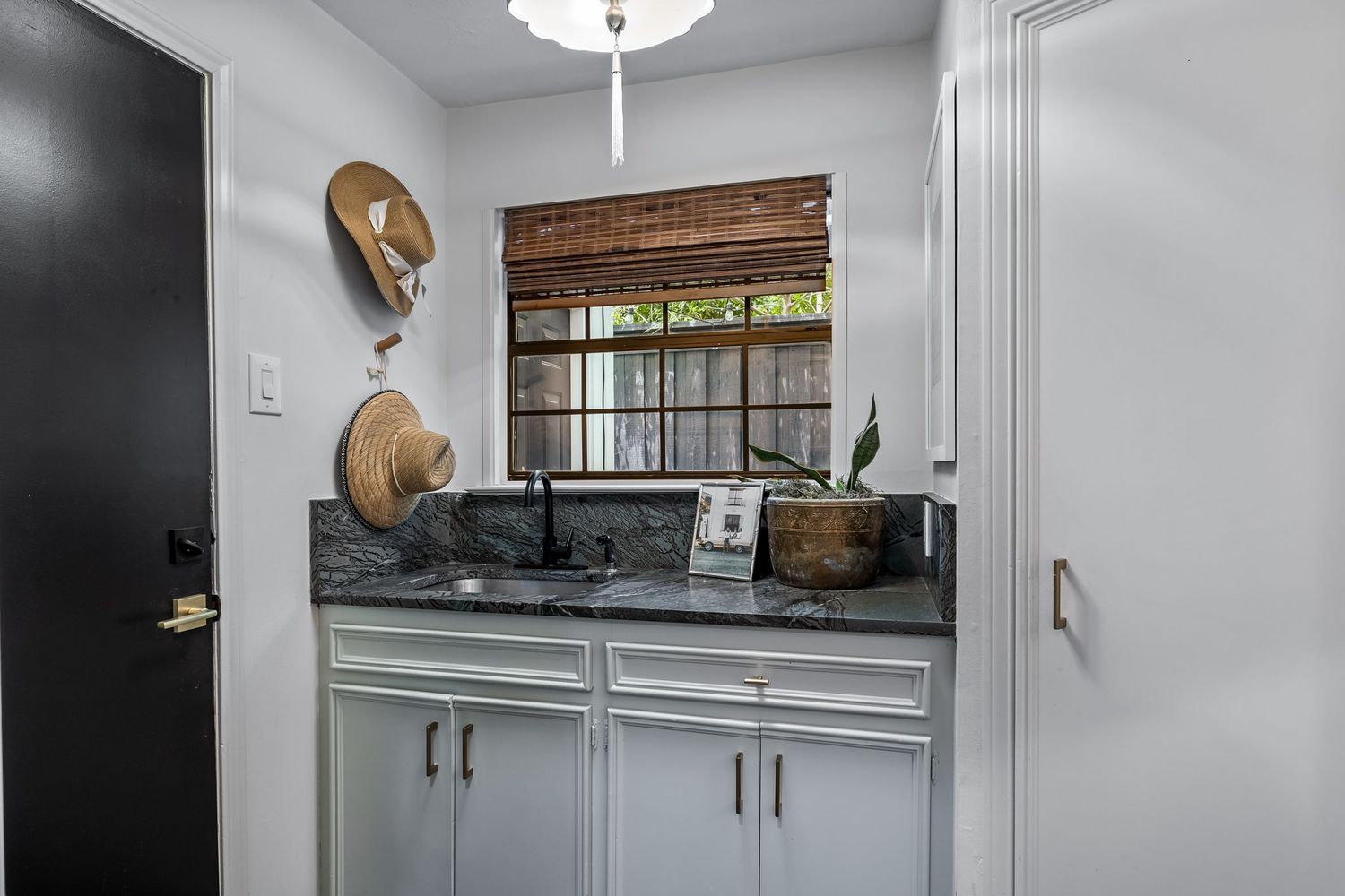 The primary bedroom vintage chandelier is from Southern California and is classic Hollywood Regency style. The entry and mudroom lights are beautiful pendants from Anthropologie. The wallpapers are neutral colors (all tan and white) but the palm and marbleized patterns add some eye-popping interest. My favorite lights in the house are the brass and frosted globe pendants in the bar. They’re so fun and make the cool space shine.