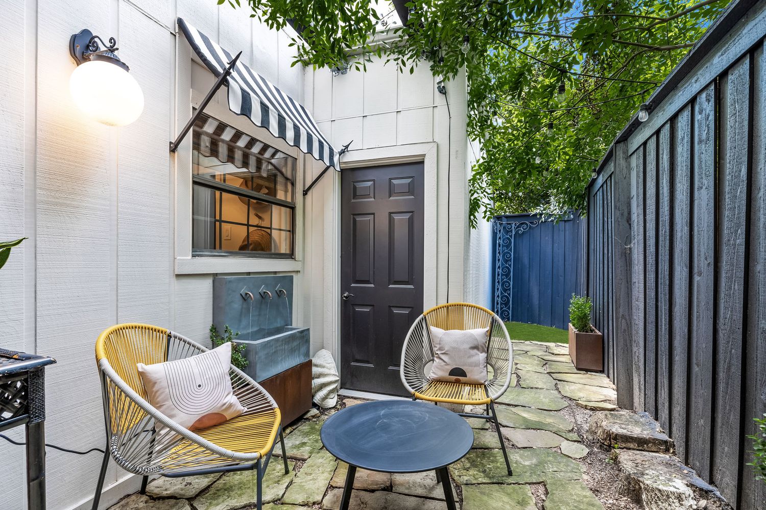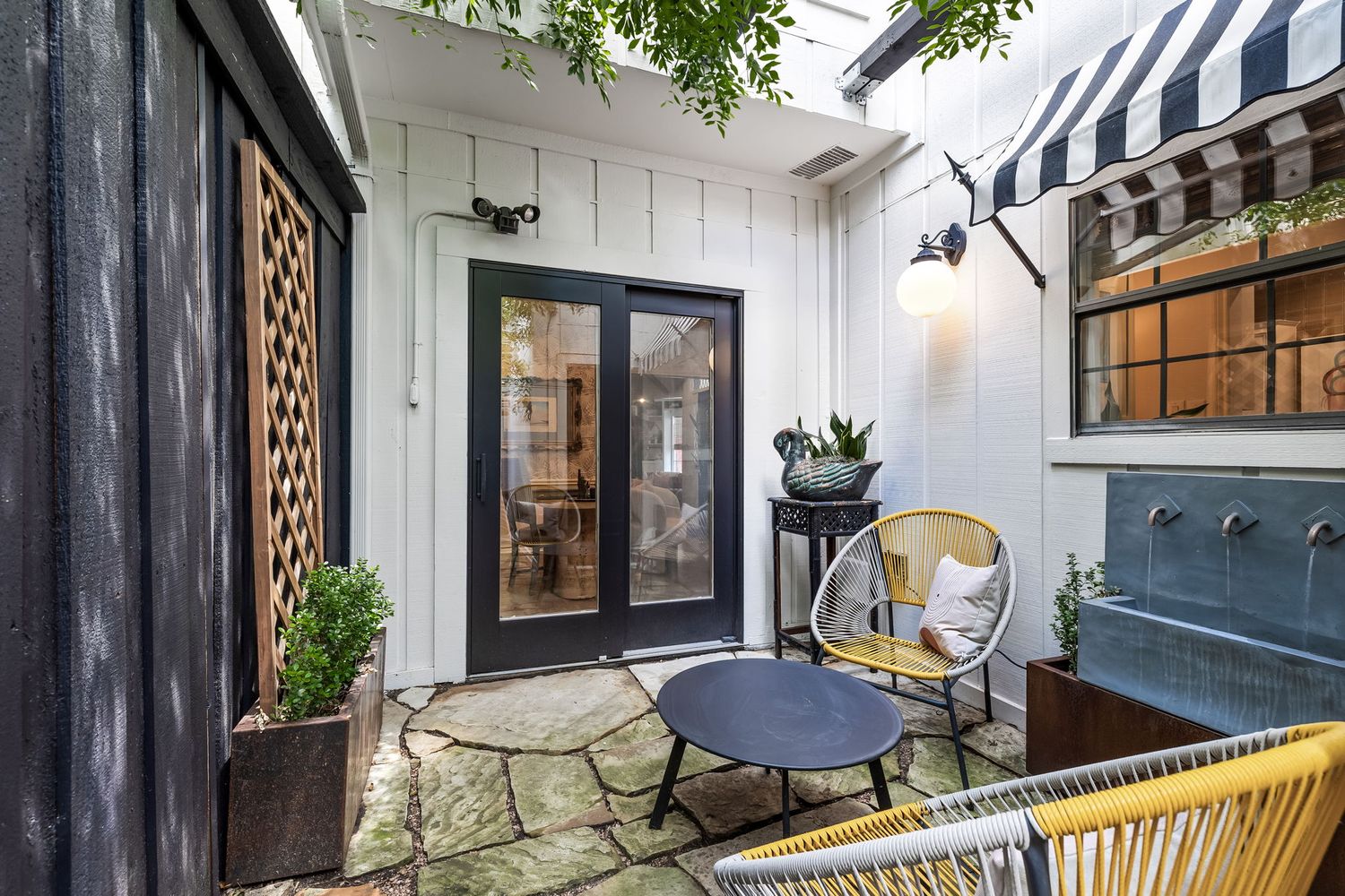 Brittany Cobb: Besides the amazing location, I wanted a lock-and-leave place that oozed charm and function. This place had all that and more! Being from California, outdoor space is important to me. The front courtyard was so charming from the vintage iron gate to the established plants and beautiful leaded beveled diamond front door surround. Inside, the layout was so unique, the living room bookcases were so stylish, and the primary bedroom was so much bigger than expected.